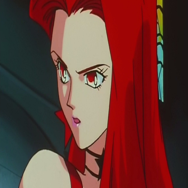 This is a picture of Eudial, a fictional character, the first and the leader of the 5 Wizards in Sailor Moon. Eudial tied her shoulder-length red hair into two loose ponytails, one at the back and one on the left side of her head. Like the other members of the Witches 5 organization, she has a black star adorning her neck.